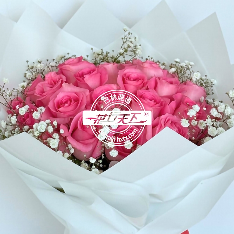 描述: 粉色玫瑰和满天星组成、精美包装。