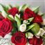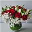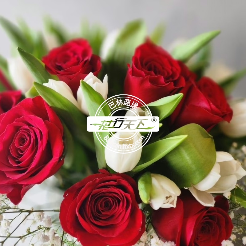 描述: 红玫瑰12支、白色郁金香20支和满天星组成、玻璃花瓶装。