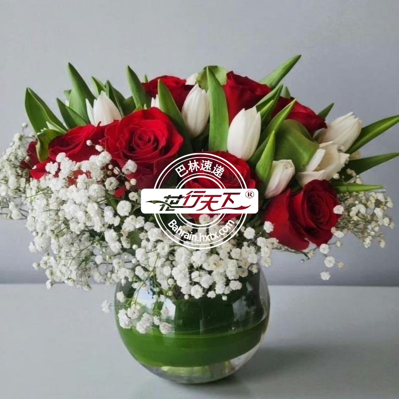 红玫瑰12支、白色郁金香20支和满天星组成、玻璃花瓶装.